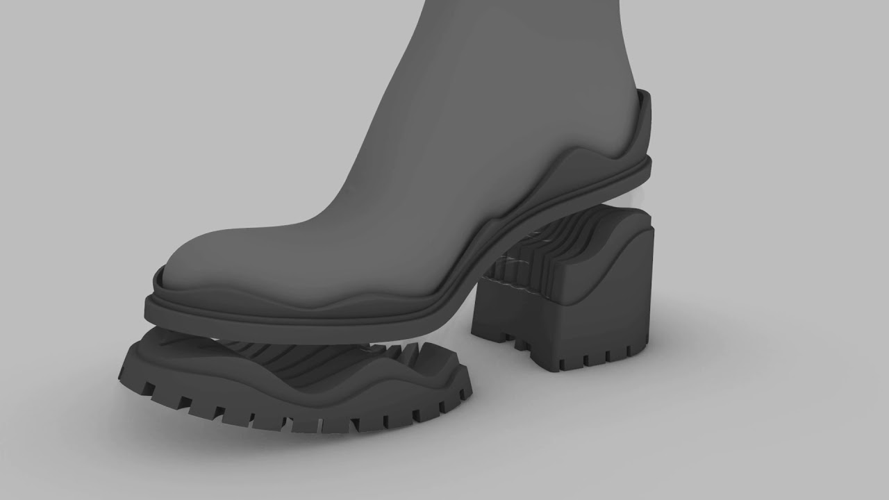 For my final collection, I studied the organic shapes of mushrooms, in particular the hymenium which includes both symmetrical forms and the random. Both traditional craftsmanship and modern techniques such as 3D printing were used to construct sculptural parts of shoes, like the outsole for the boots and the upper of the yellow sandals made up of strips of leather.